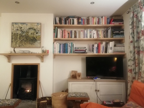 These are a set of three waney edged  maple book shelves fitted into an alchove